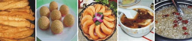 油条、油饼、欢喜坨(麻元)、糯米鸡、鸡冠饺、豆浆、豆腐脑、清酒、蛋酒、糊米酒